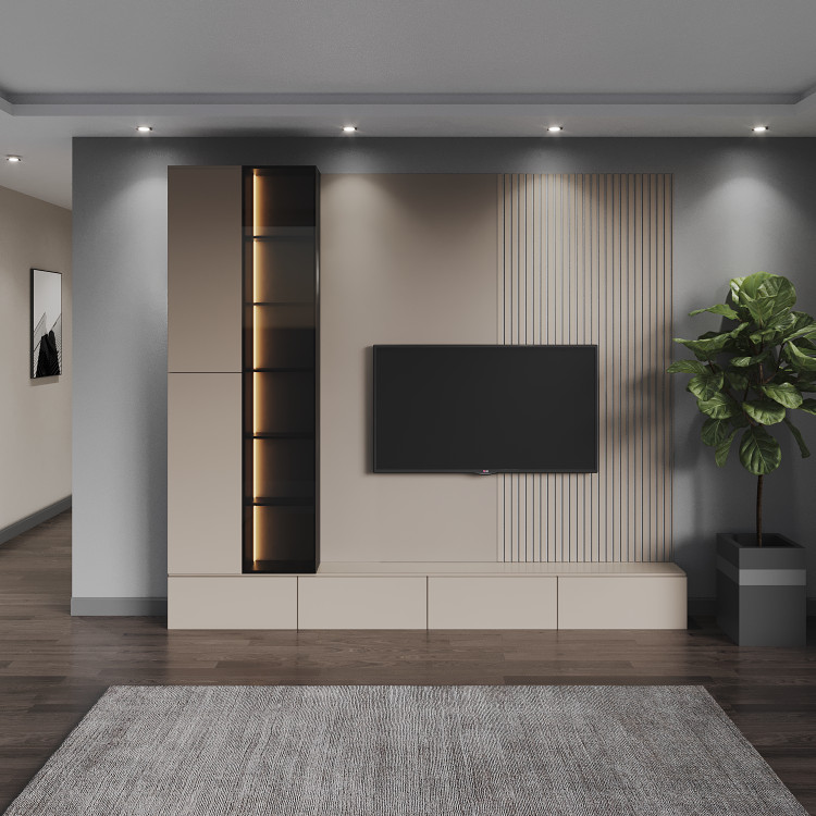 امکانات موجود به همراه میز: پریز توکار پشت تلویزیون، لاین نوری داخل باکس